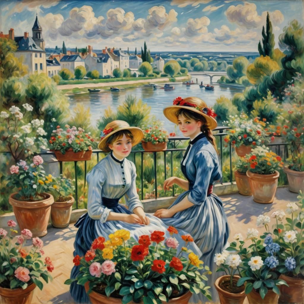 This image shows two sisters on a sunlit terrace overlooking a tranquil river. The impressionistic scene features soft brushstrokes, dappled light, and vivid colors reminiscent of Renoir's style.