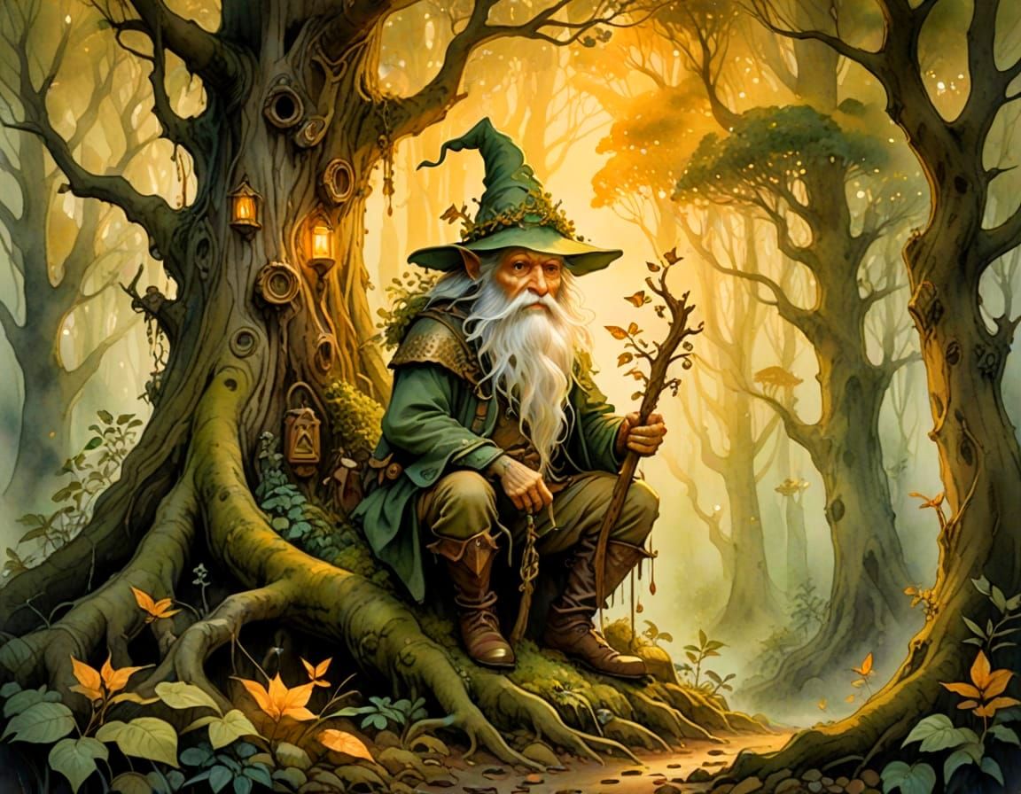This image shows an elderly goblin in a whimsical forest bathed in golden light. The watercolor art style features soft contours, warm tones, and an ethereal, fairytale-like atmosphere.