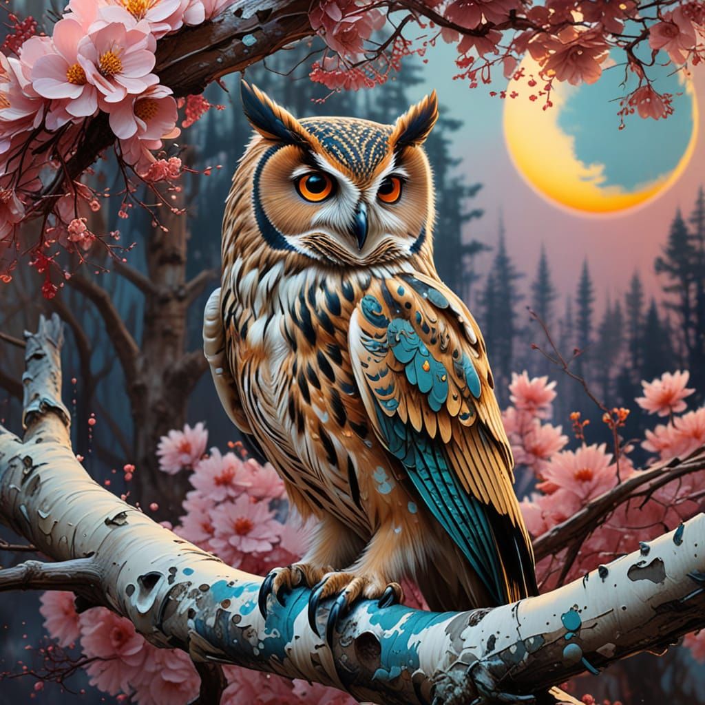 This enchanting impressionist painting captures an owl perched on a blossoming twig under the soft glow of dawn. Vivid, iridescent blue wings glisten with dew, surrounded by drips of paint and bold brushstrokes. A harmonious blend of traditional and modern elements creates a dreamlike, surreal atmosphere...