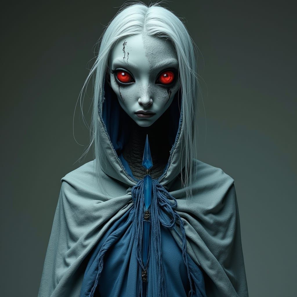 This image depicts a tall, gaunt man with a scarred face and a missing eye. He has a bright red eye and wears a silvery grey and blue gown, rendered in a dark, gothic style.