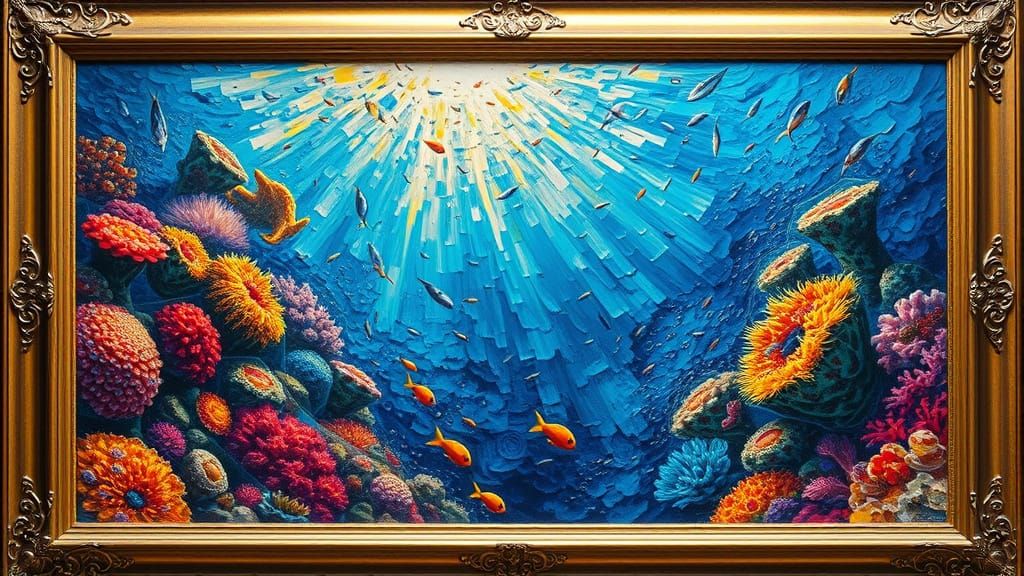 A vibrant painting of a colorful coral reef teeming with sea life. This impasto-style artwork captures the underwater scene with thick brushstrokes and rich textures, illuminated by warm, filtered light.