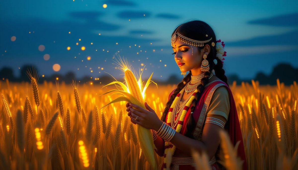A mystical Indian girl in traditional harvest attire stands in a field of glowing wheat under a twilight sky, holding radiant corn. Features magical realism and an enchanted atmosphere.