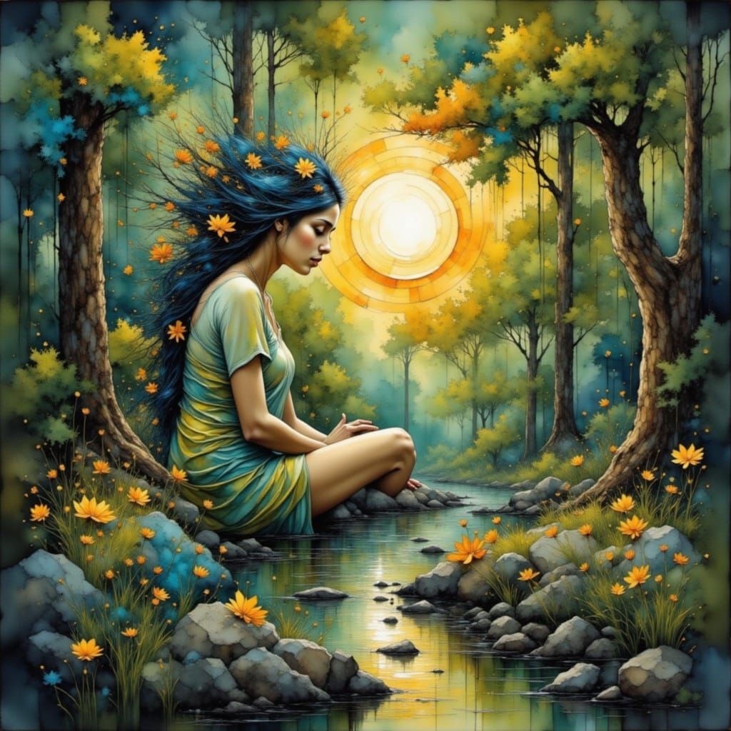 A vibrant watercolor and alcohol-ink drawing of a serene deity with cosmic fractal patterns, levitating amidst otherworldly stars. The artwork blends Art Deco influences with Klimt-inspired gold touches, rendered with impasto brush strokes.
