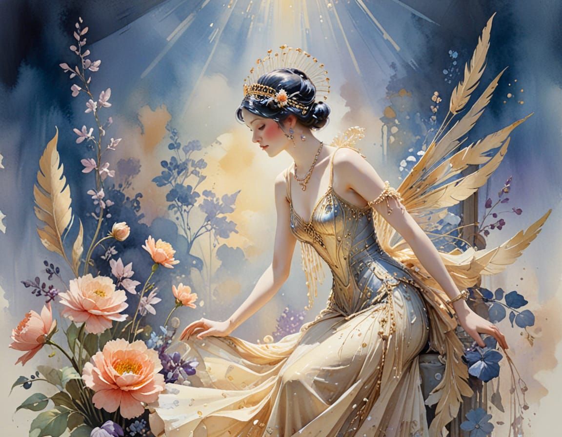 A digital painting of an Art Deco cabaret queen in a sapphire and gold headdress and champagne-toned gown, set against a marble theater backdrop with golden spotlights. The artwork features a creamy, pastel palette.