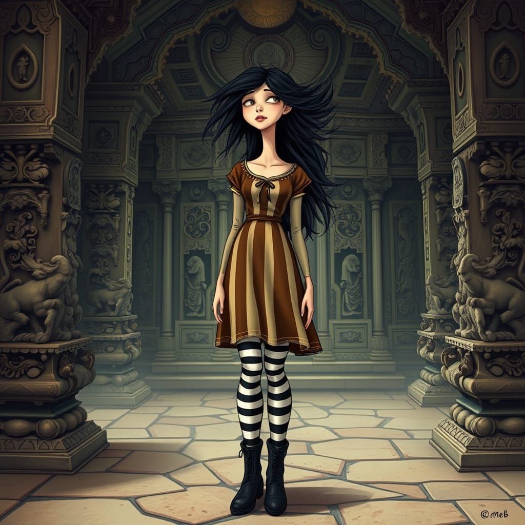 A striking picture of a young woman with wild dark hair, wearing a striped dress, patterned tights and boots. The setting is an antique temple with intricate carvings, rendered with eerie elegance and surrealist charm.
