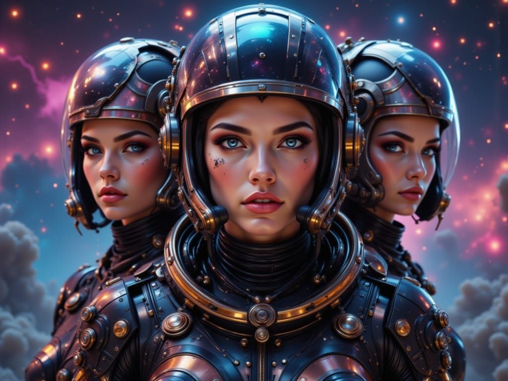 A striking image showcases the Gantenbrink's crew in spacesuits against the Andromeda 3 backdrop. This 8k resolution art blends gritty realism with vibrant colors, sleek futurism and intricate details, as trending splash art.