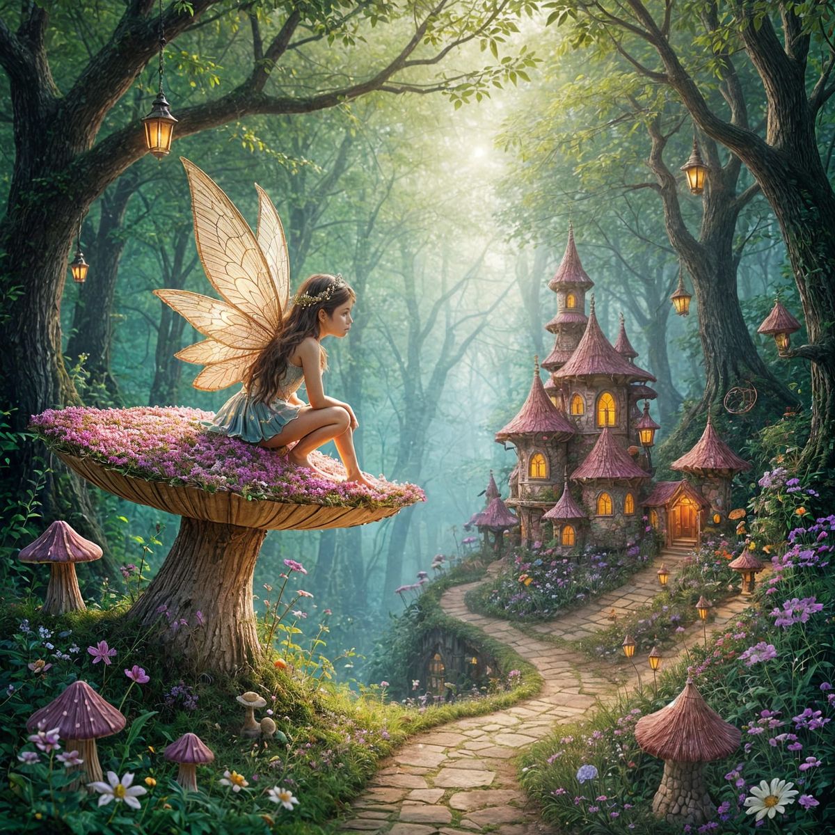 This enchanting image captures a delicate fairy as she touches down on a toadstool, surrounded by the serene beauty of a mystical fairy village, with intricate line work and watercolor textures reminiscent of classic fairy tale illustrations.