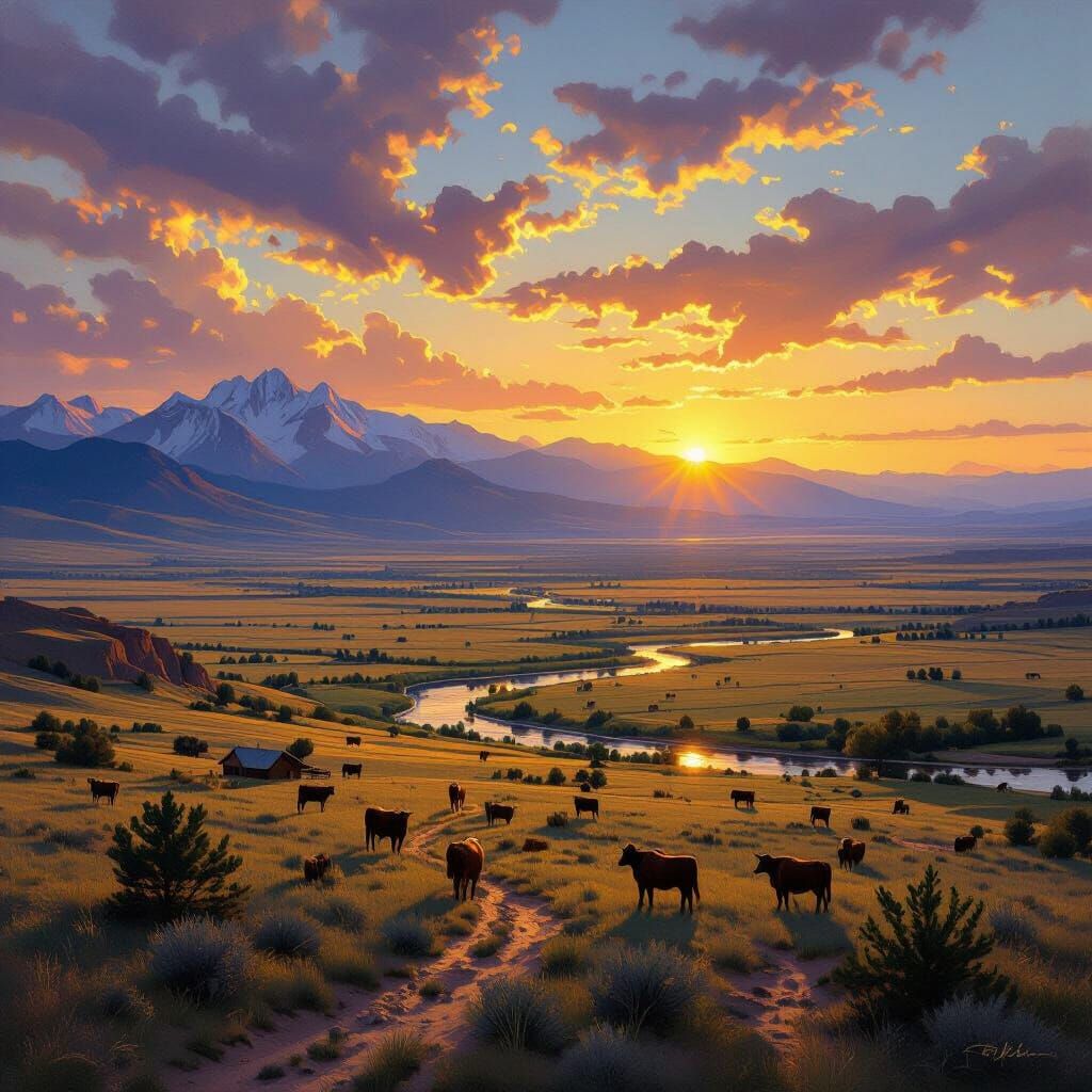 This oil painting captures a sweeping vista of the San Luis Valley at sunrise, showcasing plains, rivers, and mountains with ranchers and cattle. Rendered in a Romantic Realism style with chiaroscuro lighting.
