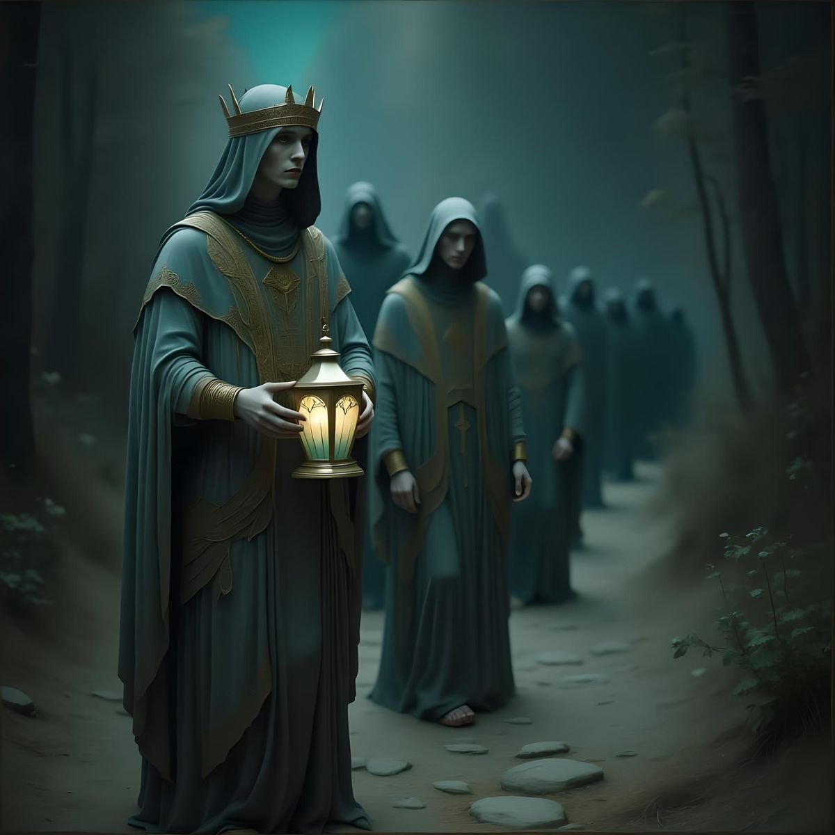 <lora:Medieval Spirit Flux:1.0> A dark, mystical procession led by a human cleric, dressed in flowing robes, who carries an ethereal lantern that glows faintly. The cleric wears a crown made of moth wings, giving them an eerie, otherworldly presence. Behind them, a group of hooded figures follows in ...