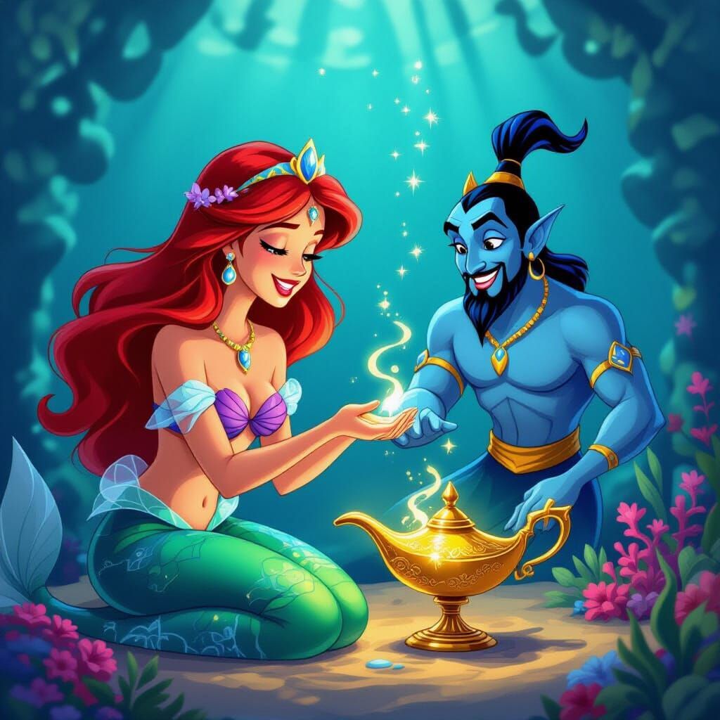 This image shows a mermaid interacting with Aladdin's lamp, resulting in the genie's appearance. The scene is whimsical and combines elements from different fairy tales.