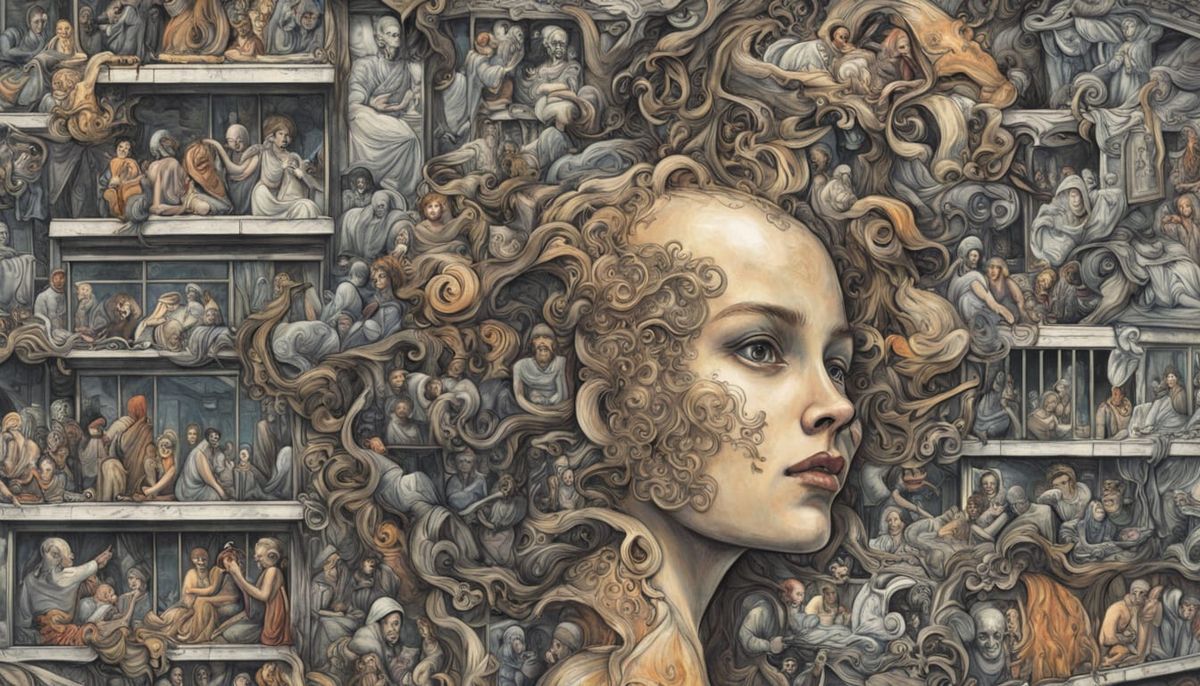A haunting image of a dystopian metropolis, overrun by neon advertisements and twisted skyscrapers, as people succumb to addiction and the empty pursuit of perfection.