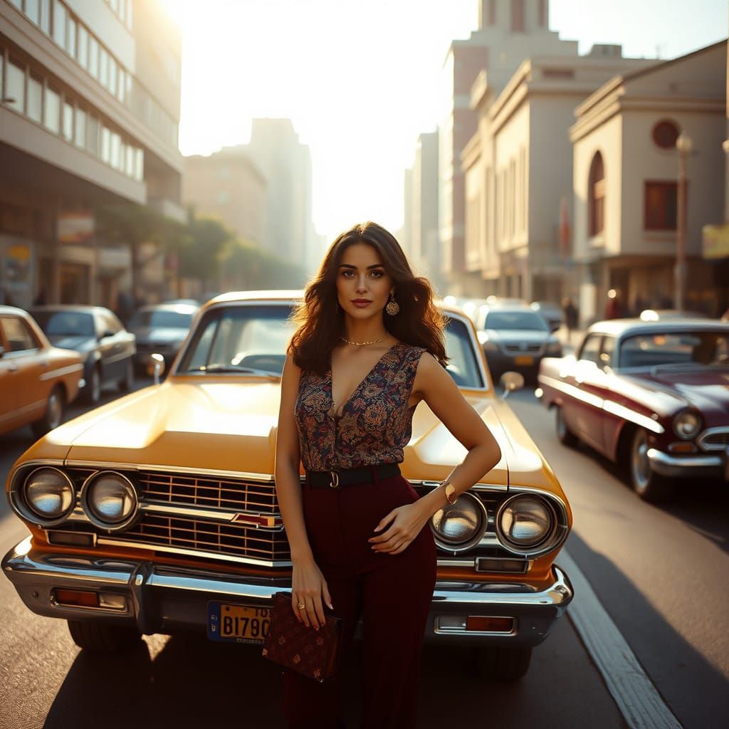This image shows a stylish Iranian woman in 1970s Tehran, next to a classic Chevrolet. Golden sunlight illuminates the bustling street scene with vintage cars and mid-century architecture.
