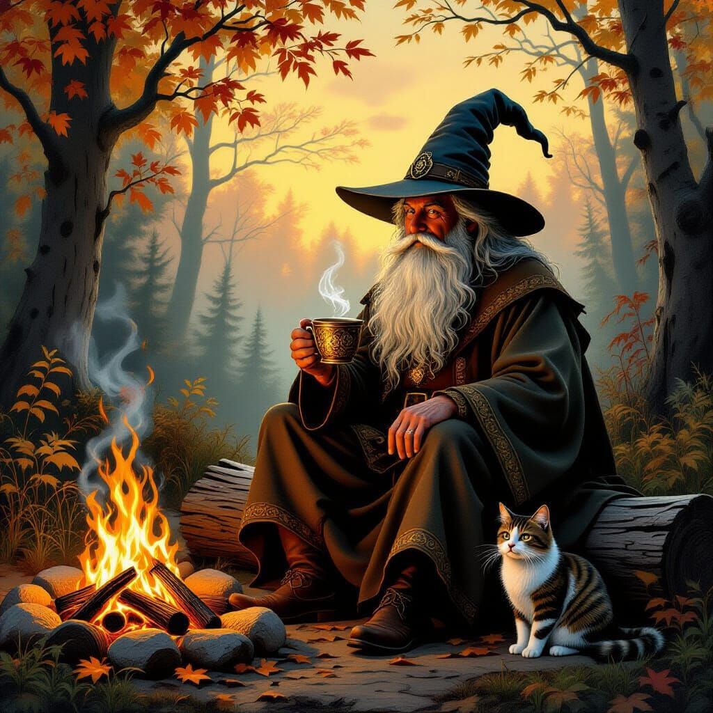 This was a favorite of mine. Nice wizard, great colors, I can almost hear the crackling of the fire, and a cute cat as a bonus! Overall a wonderful scene. Great job!
