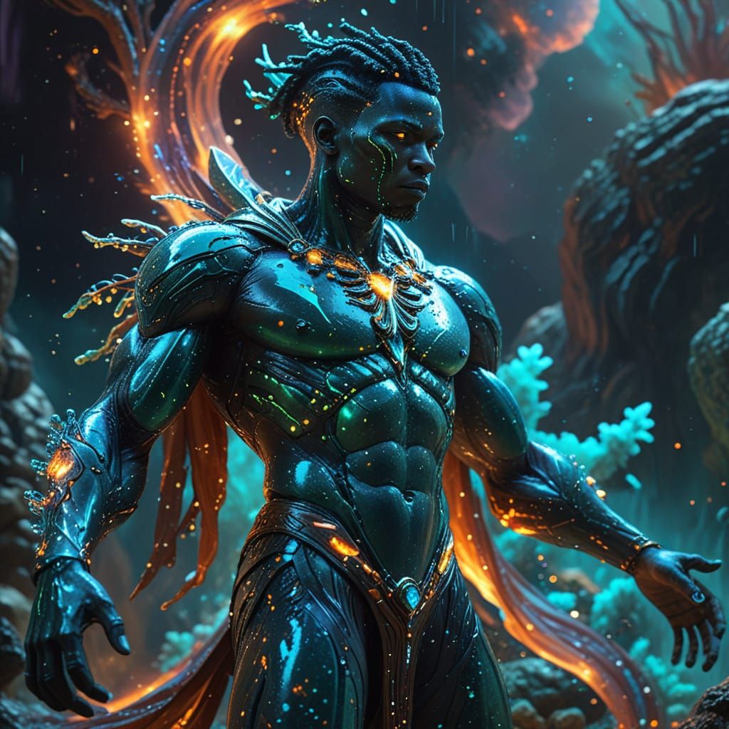 This image shows a young African god in a science fiction realm. The figure stands on a bioluminescent crystal formation, wearing robes of woven starlight, rendered as digital art with dynamic lighting and vibrant colors.