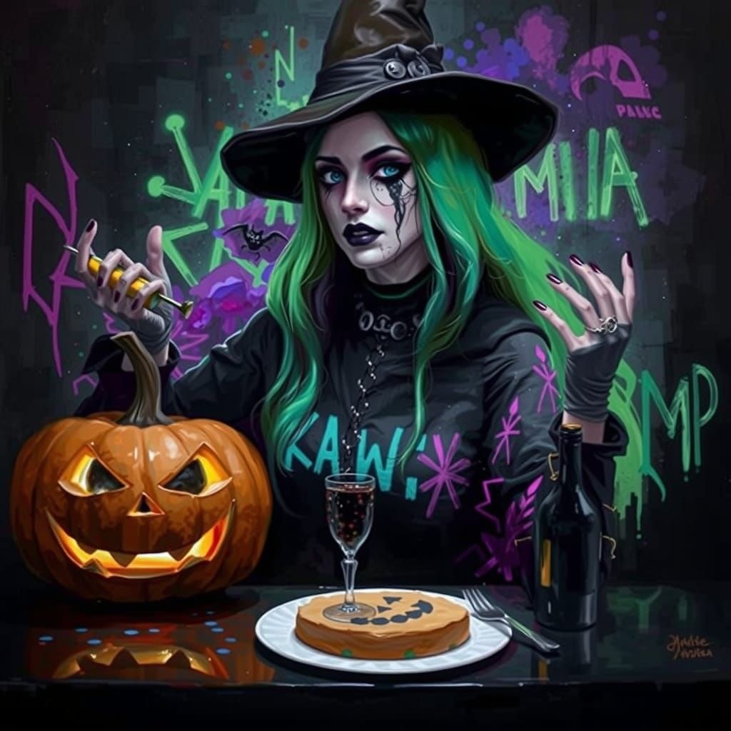 A striking image of a Halloween birthday party for witches, featuring pumpkin cakes and wicked drinks. Rendered as a vibrant, textured oil painting with dramatic colors.