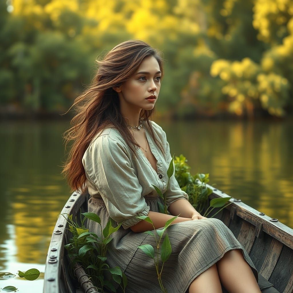 A hyperrealistic image of a woman in vintage attire in a boat on a tranquil lake. Lush plants adorn the boat, with soft, blurred background elements and cinematic lighting.