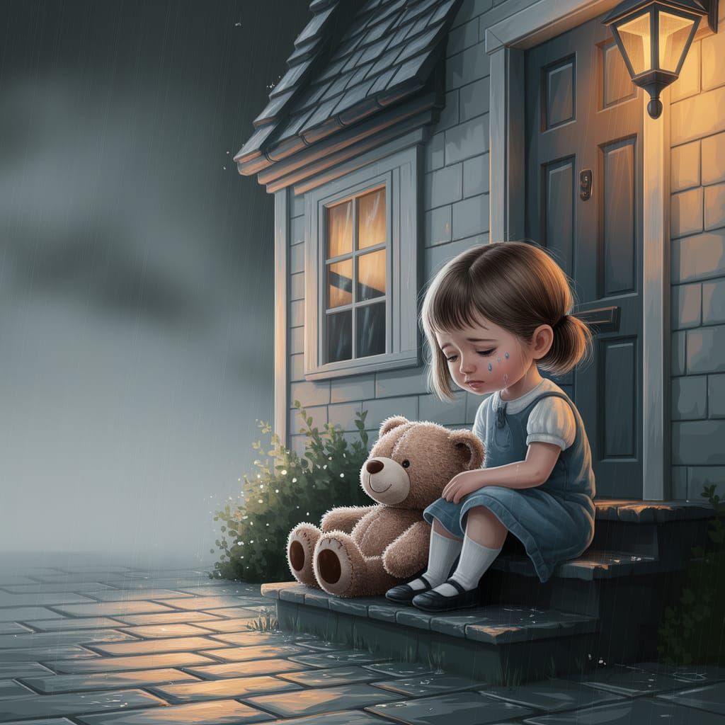 A digitally painted illustration of a sad little girl sitting on stone steps in the rain. The scene, filled with melancholic gray tones, is softened by golden light and a tattered teddy bear.