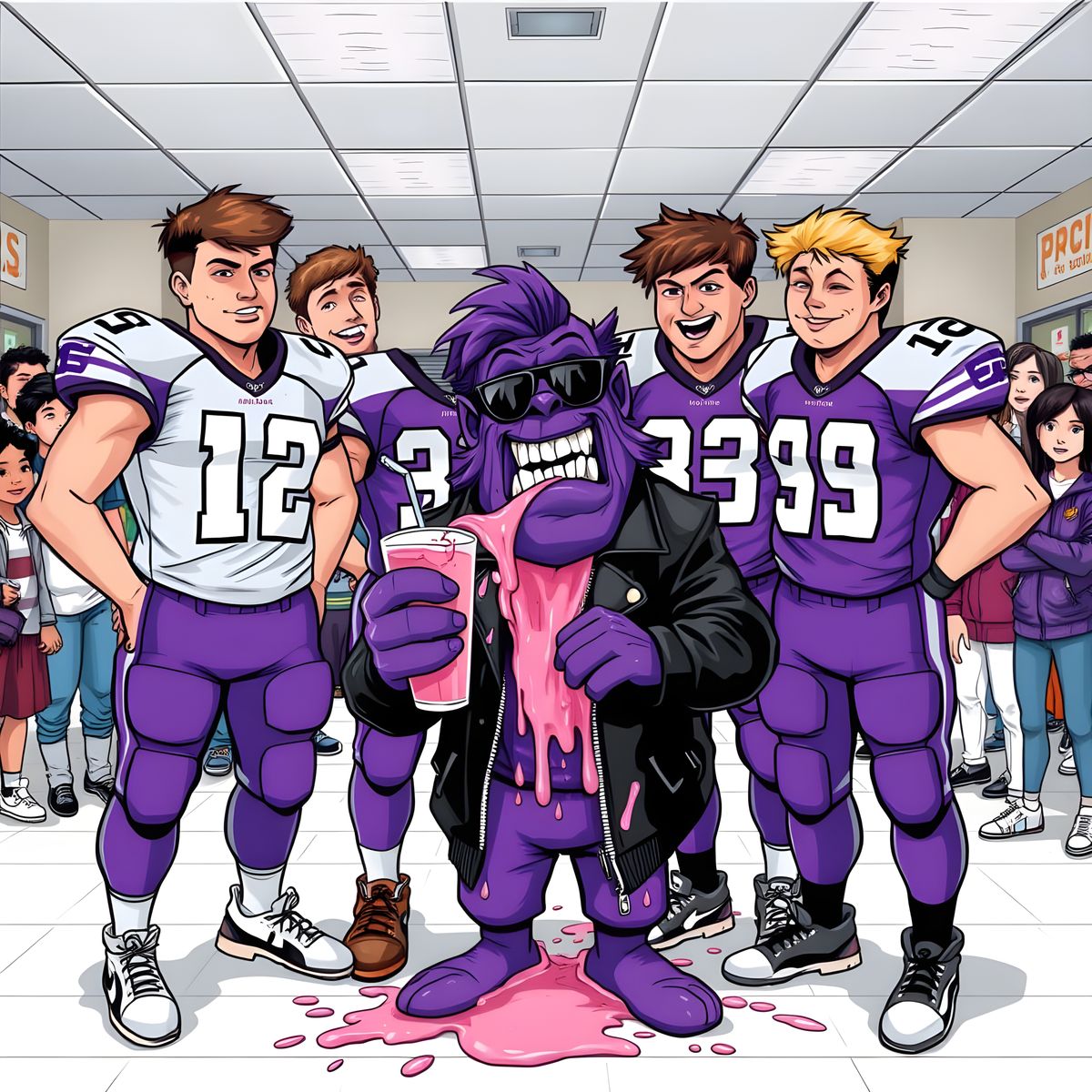 This image depicts a humorous scene of football players teasing a purple, evil Grimace after he's been doused with his own milkshake in a school cafeteria setting, showcasing a playful and lighthearted atmosphere.