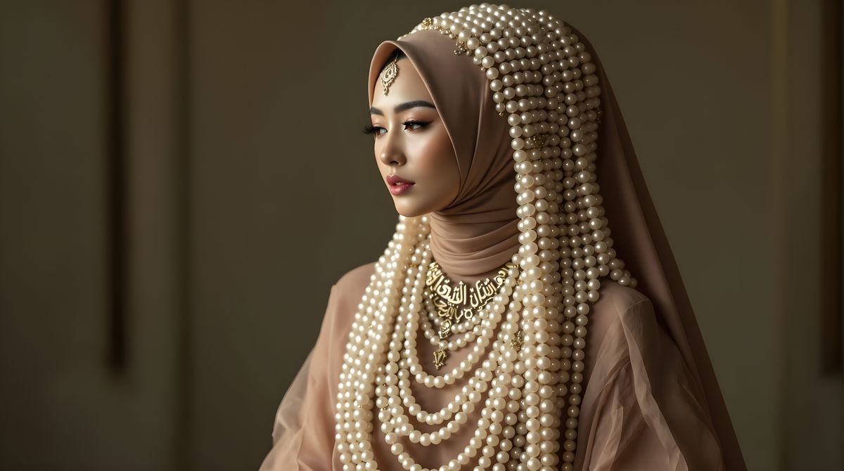 This image depicts an Asian woman in a hijab, wearing a sheer dress, long pearl wig, pearl body chain, Quran necklace, and Arabic earrings, created in a conceptual art style.