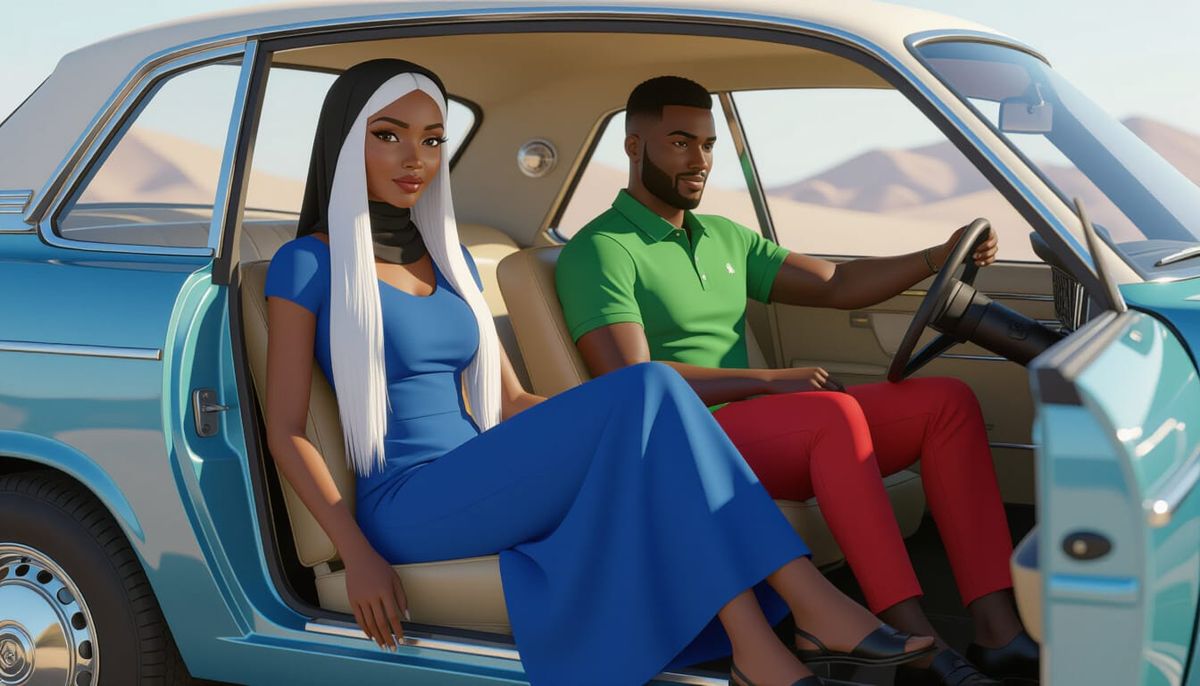 A hyperrealistic animated image of a young African woman with white hair in a blue dress, seated beside a man in a car. Features cinematic lighting and vibrant colors, trending on Artstation.