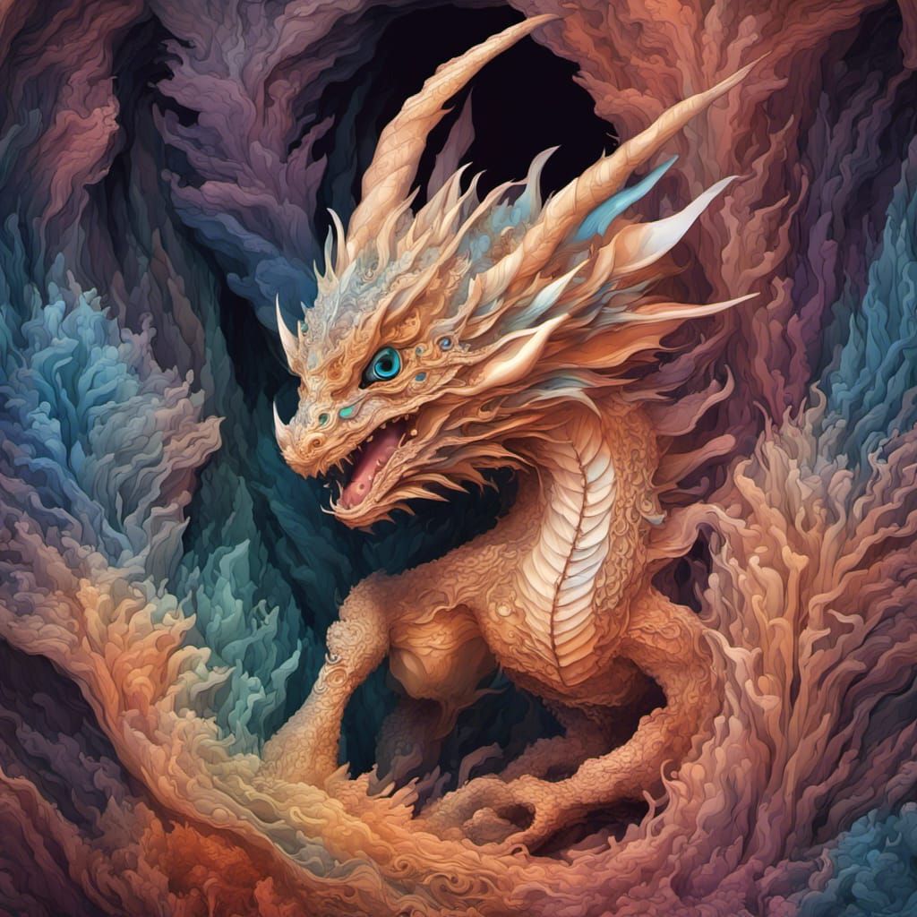 This image shows a tiny baby dragon nestled within Reed Flute Cave. The dragon's intricate details and vibrant colors create a harmonious integration with the cave's natural formations.
