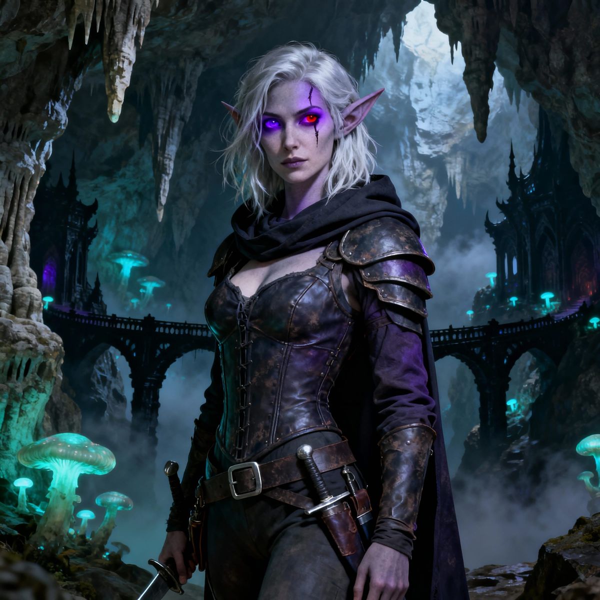 A full-body depiction of a dark elf woman in a realistic fantasy style. She features striking violet and crimson eyes, dusky gray skin, and worn leather armor, standing confidently in a glowing cavern.
