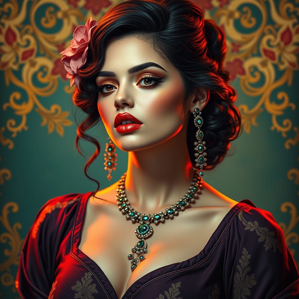 This image features a stunning portrait of a woman of color, an artist and powerful singer who broke barriers and revolutionized the music industry. With elegant attire, vibrant jewelry, and dynamic lighting, she exudes confidence and creativity, showcased in a hyper-realistic style blending elements of ...