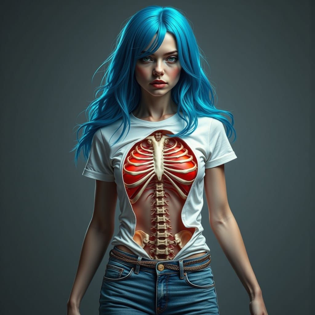 This image shows a woman with long blue hair wearing a white t-shirt and blue jeans. The t-shirt reveals a biomechanical view of her skeletal structure in a biopunk aesthetic.