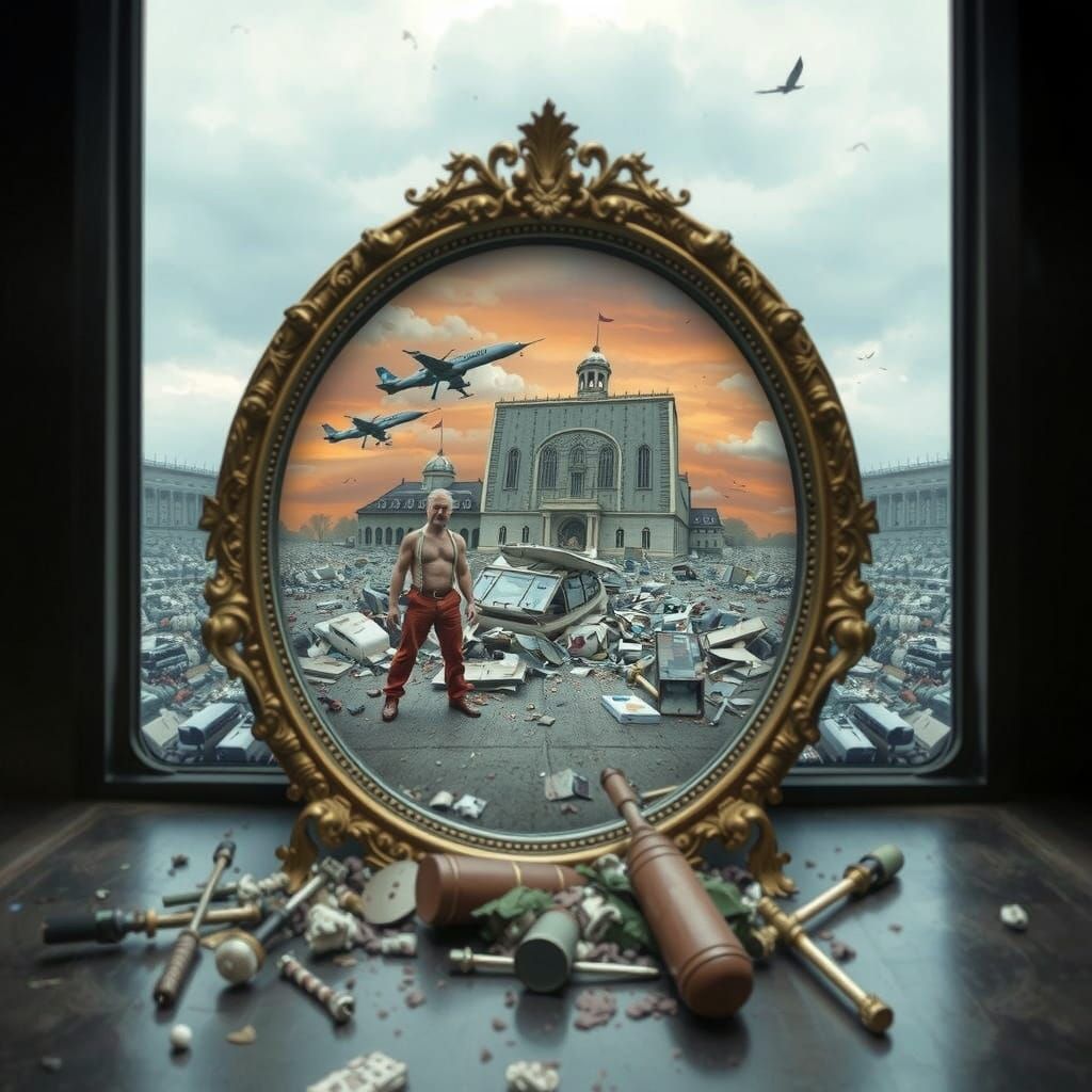 This image shows a nude figure standing tensely amidst fragments of tools and symbols. Ornate mirrors reflect roles and expectations, not the individual, creating a scene of vulnerability and awakening.