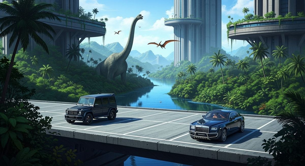 This image shows a futuristic cityscape with brutalist architecture and lush vegetation. A Brachiosaurus grazes by a blue river while a Pteranodon flies above. Modern vehicles are parked on a concrete lot in this manga-style artwork.