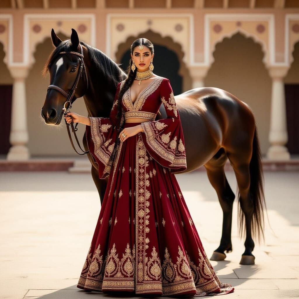 A striking picture of an Indian model in couture posing with a black horse in a palace courtyard. The model wears a wine-red gown with embroidery, captured in golden hour light.