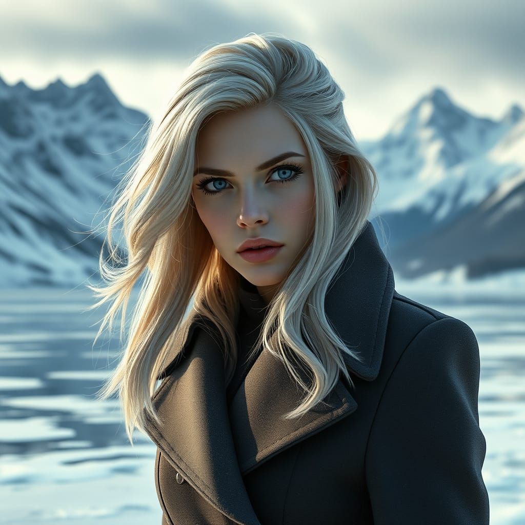 This image shows a confident ash-blonde woman in a long coat against a dramatic, icy mountain landscape. The image is reminiscent of 3D game graphics with intricate details and dynamic lighting.