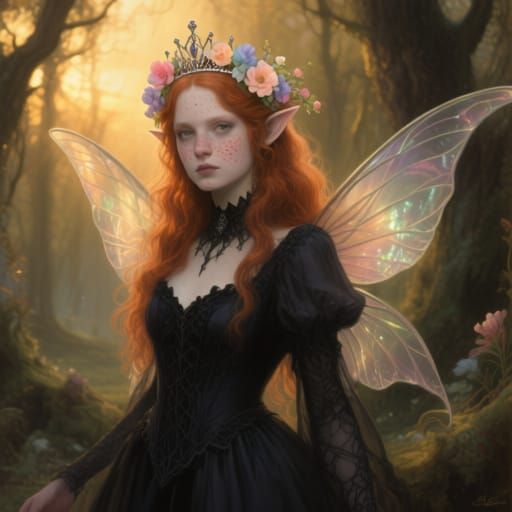 This hyper-realistic painting shows a gothic fairy with copper hair and flower tiara in a mystical forest during golden hour. Features ethereal lighting and intricate details.