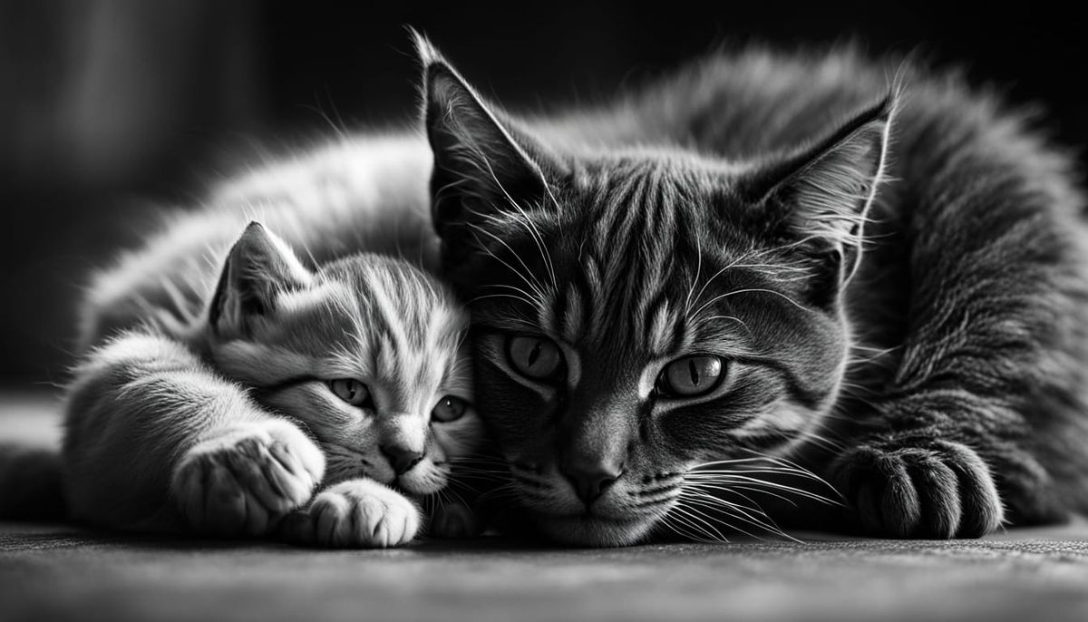 This intimate black-and-white portrait captures a cat mom's tender moment with her newborn kittens, their tiny paws reaching for her in a heartwarming scene with soft focus and warm glow.