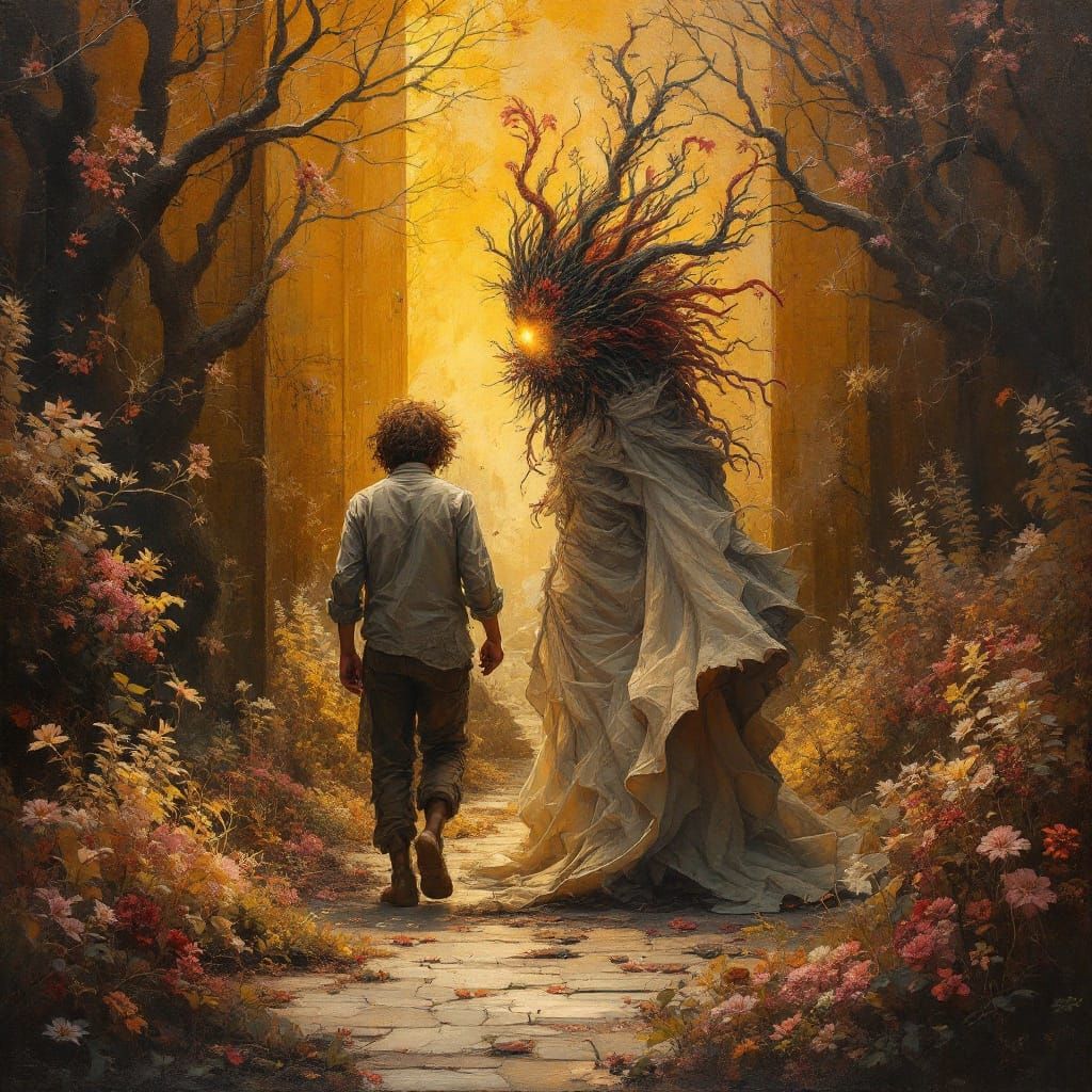 This image shows a surreal scene with figures rendered in amber-brown tones and vivid highlights. Botanical details and organic elements intertwine with the subjects, enhanced by dramatic lighting and visible brushwork.