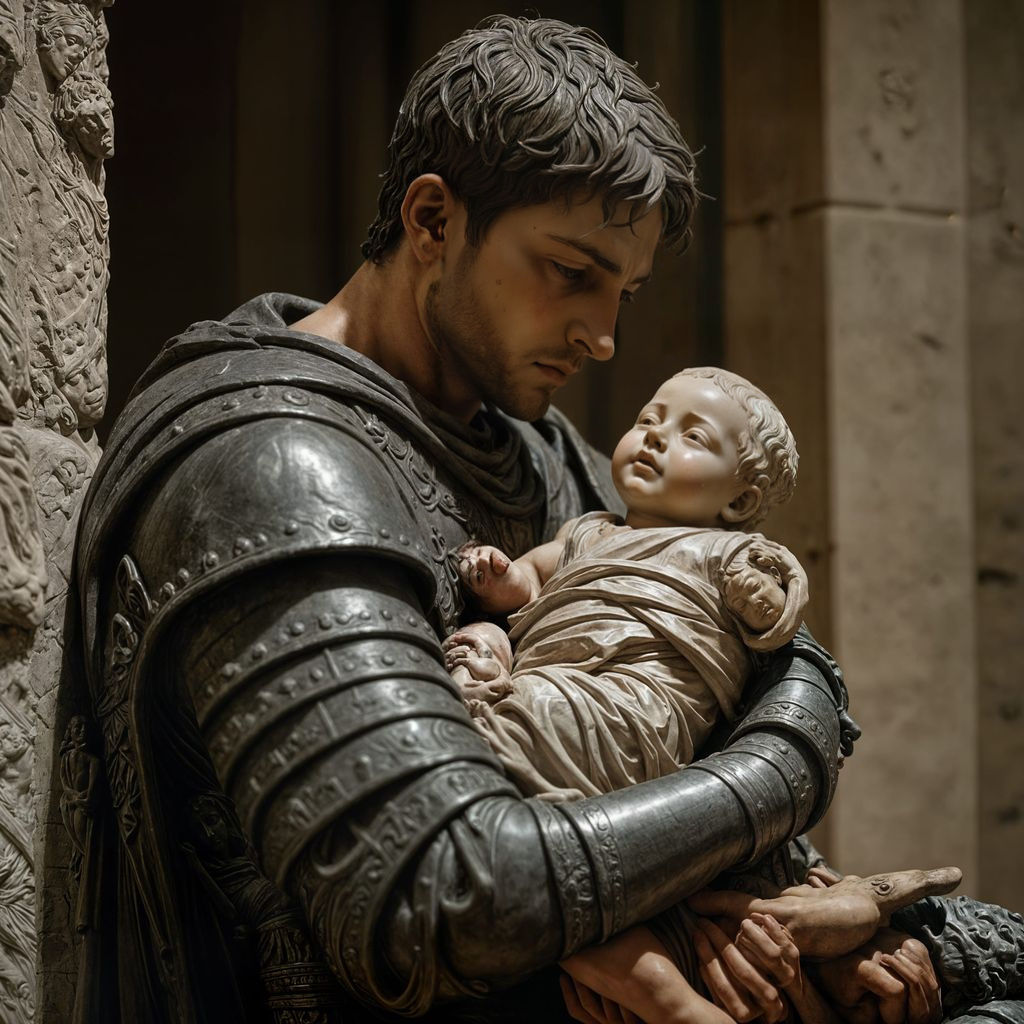 "late medieval stone statue of a young warrior with short hair is holding his infant. The father is crying. Influenced by La Pieta"