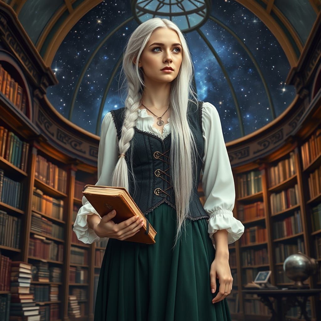 This enchanting image depicts a goddess lost in thought, surrounded by the mystical atmosphere of a fantasy bookstore. Soft natural light and cinematic shadows create a captivating scene.
