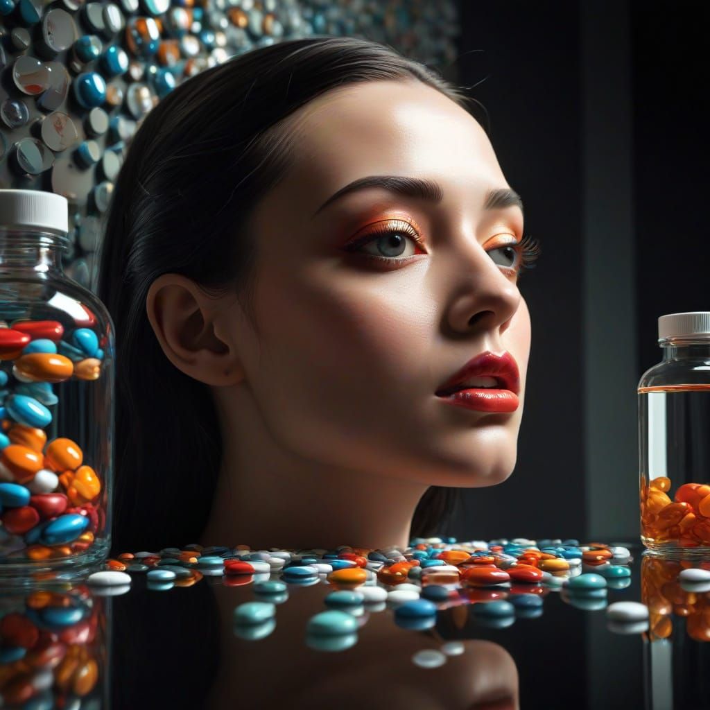 This vibrant, dreamlike image depicts a woman crafted from medication pills, standing before a mirror wall. High contrast lighting and glassy highlights create a sense of depth, while reflections and refractions add to the surreal atmosphere.