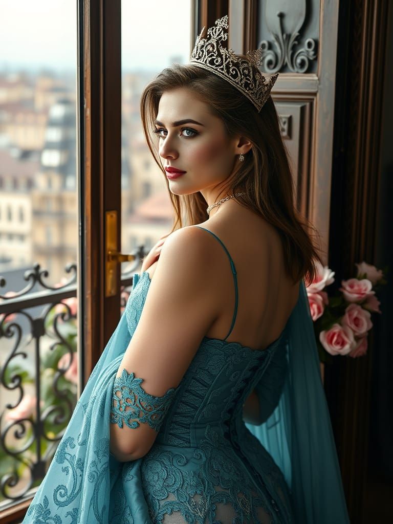 This portrait of a sensual androgynous figure exudes glamour and regality, with intricate lace details and a stunning cityscape view. Inspired by Art Deco and Romanticism, the subject's confident expression and subtle smile add depth to the elegant scene.