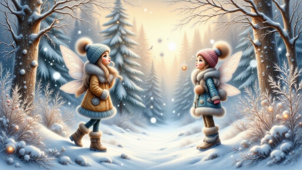 This image shows two adorable fairy children joyfully catching snowflakes in a beautiful, snow-covered deciduous forest. Rendered in a mixed-media ink drawing style with a serene, fantastical atmosphere.
