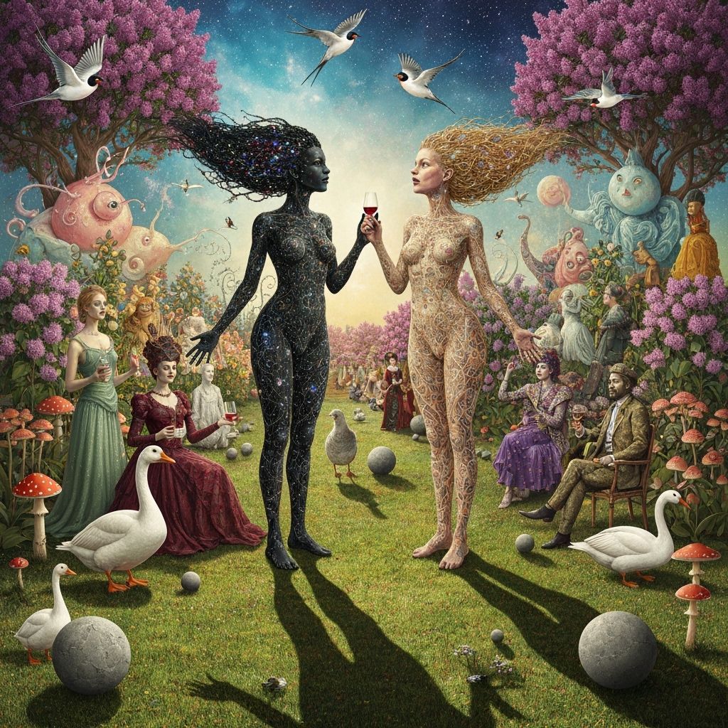 A striking artwork depicts a dark goddess with stardust hair, her translucent body glowing as she catches the sun and moon. Features intricate webs, diverse flora, and cosmic surrealism influences.