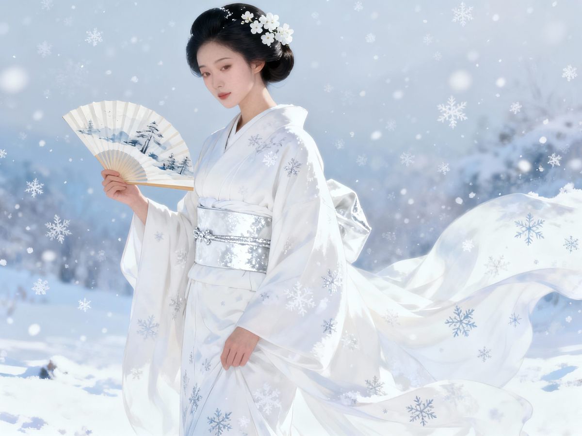 This image depicts an elegant Geisha gracefully posing amidst a serene winter landscape, embodying traditional Japanese beauty and tranquility.