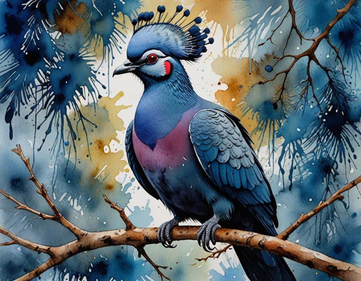 A stunning mixed media artwork featuring a majestic blue-grey western crowned pigeon perched on a tree branch, showcasing vibrant watercolor and alcohol ink splatters in a unique splash art style.