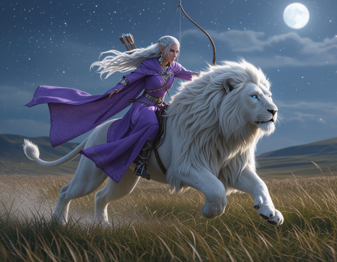 This image shows a silver-haired elven huntress in a lavender robe, leaping on a white lion. Features realistic textures, moonlight, and cinematic effects for a fantasy film aesthetic.