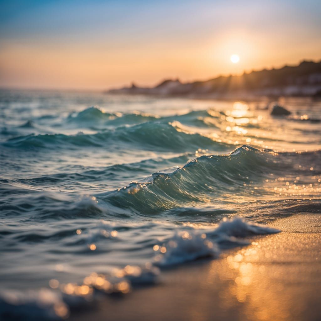 A breathtaking seascape photograph at golden hour. The image captures a wide, naturalistic view of a blue sea with sparkling water droplets and soft wave textures under warm, sunny horizon lighting.