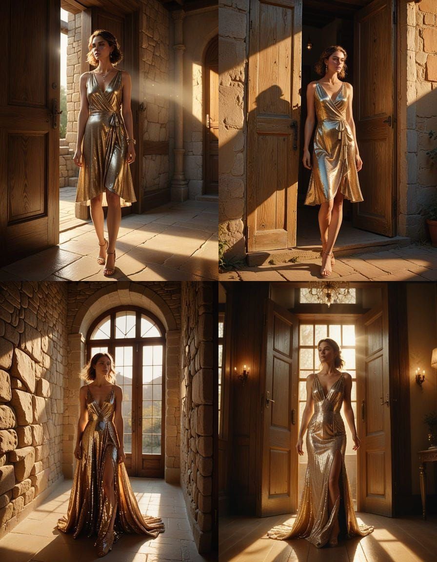 This image shows a hyperrealistic full-body portrait of a beautiful woman in a shimmering dress, pantyhose, and jewelry. The setting features an old wooden door, stone walls, high ceilings, and indirect window lighting.