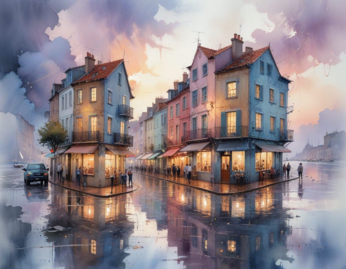 This image shows a rain-kissed coastal town at dusk. Cobblestone streets glisten, pastel buildings reflect in puddles, and mist rises from the sea, all rendered in a delicate watercolor style.
