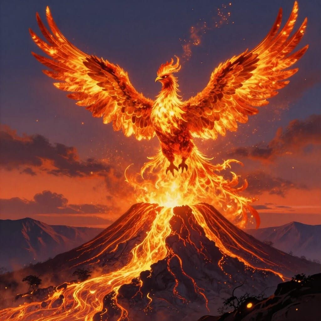 This image shows a majestic phoenix with sunset-colored feathers emerging from volcano ashes. Fiery lava flows contrast with the bird's plumage under a twilight sky, in an epic fantasy art style.