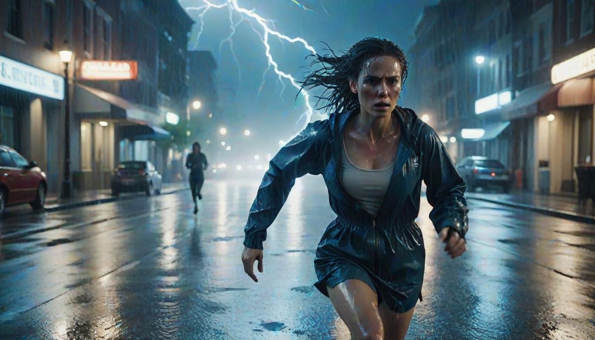 A cinematic still captures a woman running on a rainy street at night. Lightning illuminates the scene, reflecting off the wet pavement in cool blue tones with moody film grain.