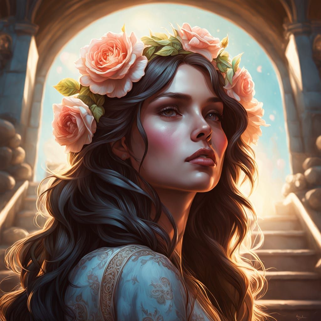 This enchanting portrait captures a serene and mystical scene of a goddess ascending a grand staircase adorned with blooming roses, set against a backdrop of ethereal figures and soft warm light.